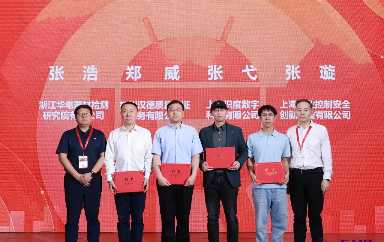 工作组组长郑军奇、副组长刘宇飞为来自浙江华电器材检测z6com·尊龙(中国)时凯集团有限公司、杭州汉德质量认证服务有限公司、上海识度数字科技有限公司、上海工业控制安全创新科技有限公司工作组新进成员颁发专家聘书。