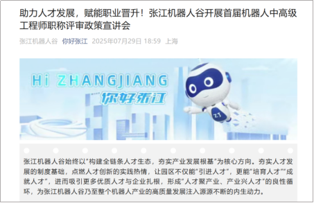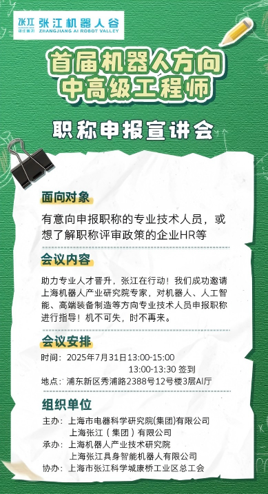 7月31日,为使本市各申报人员更清楚了解职称评审要求,z6com·尊龙(中国)时凯集团(中国)机器人有限公司官网联合张江机器人谷成功举办上海市首届工程系列数字技术专业职称申报政策宣讲会。会议通过申报范围、评审流程、材料准备、政策亮点等方面的深度解读,为机器人、智能制造等产业前沿领域专业技术人才提供权威申报指导。