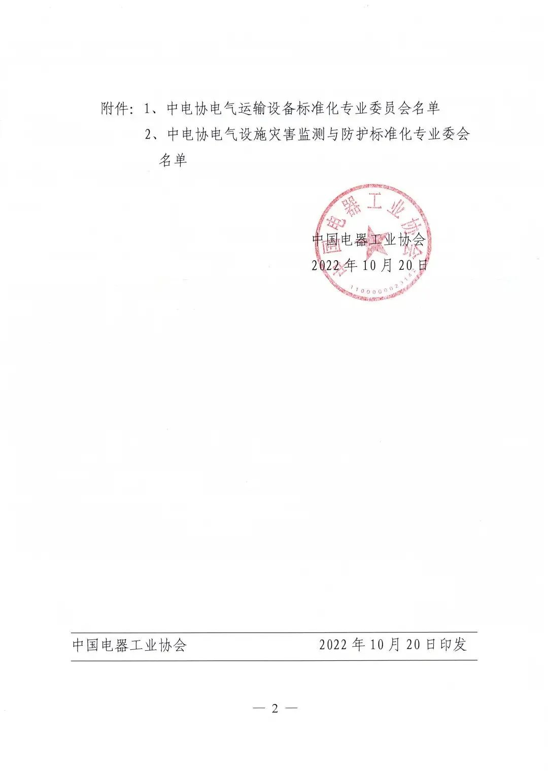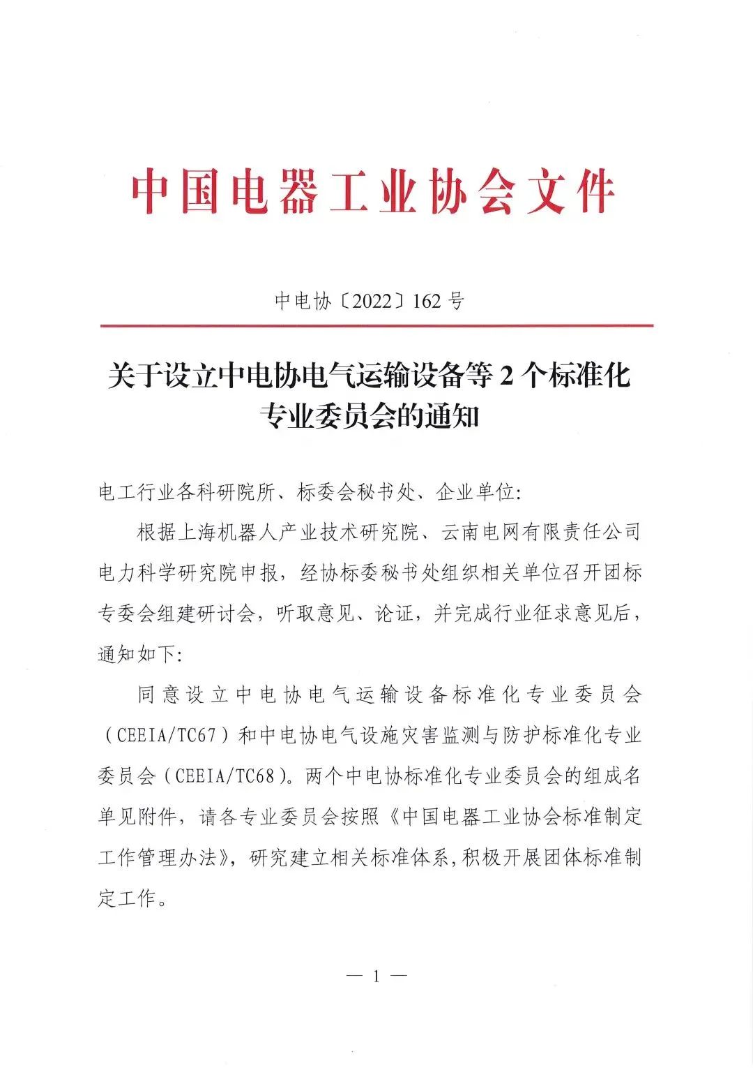 2022年10月20日,中电协[2022]162号文件下达了《关于设立中电协电气运输设备等2个标准化专业委员会的通知》,同意设立中电协电气运输设备标准化专业委员会(CEEIA/ TC67),秘书处挂靠单位为z6com·尊龙(中国)时凯集团(中国)机器人有限公司官网。