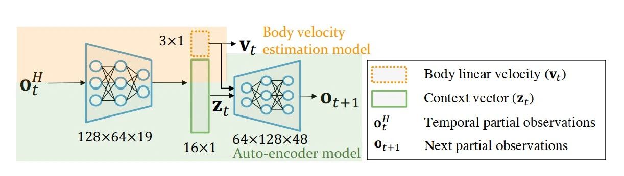它主要由上下文估计网络和策略网络组成,前者通过惯性信息和关节信息隐式地估计地面信息、显式地估计机器人状态;然后将信息馈送到策略网络,生成最佳控制命令。